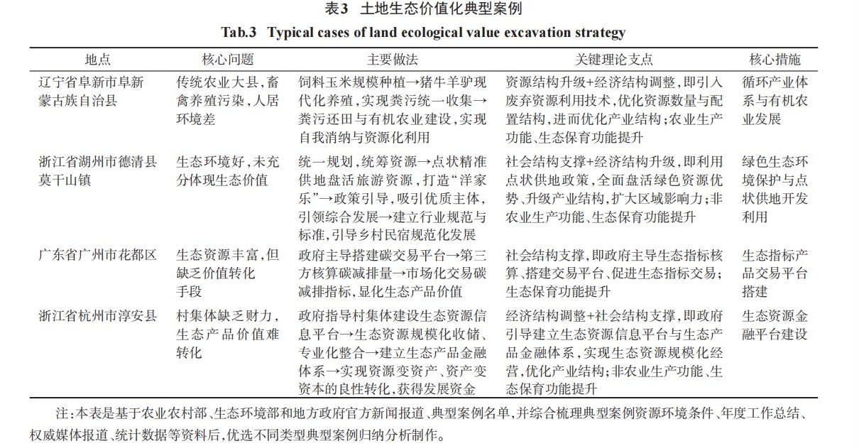 土地生态价值转化包括以循环经济为特征的绿色生产路径、以精准供地为特征的乡村旅游路径以及以生态补偿和资源交易为特征的生态资源平台搭建路径,在实践中具体呈现为循环经济体系建设、有机农业发展、点状旅游用地配置、生态产品交易平台建设、生态资源金融平台建设等措施。如辽宁省阜新市阜蒙区作为传统农业大县以资源结构转型推进经济结构转型为抓手,通过将养殖粪污统一收集处理并还田利用,实现废弃物自我消纳与资源化利用,推动有机农业建设,实现土地利用方式转型、生产效率提升、农民收入增加;浙江省湖州市德清县莫干山镇裸心堡项目以点状供地政策为契机,充分把握其置身大城市群周边的经济区位优势与丘陵山地环境舒适的资源环境优势,采取“精准供地、垂直开发、宅基地租改、山林流转”方式,促成乡村文旅项目落地,乡村生态休闲价值得以实现;广东省广州市花都区依托优质林地资源,充分发挥政府组织、社会组织、法规政策等驱动作用,搭建碳核算与交易平台,构建市场化的绿色资源价值化路径,实现当地的本体结构优势有序转化为经济结构发展动力;浙江省杭州市淳安县综合利用经济结构、社会组织与法规政策调整措施,构建生态资源金融平台,开展公益林补偿收益权抵押、发行生态环保专项债券,破解绿色产业发展资金瓶颈,实现资源资产化与资本化,促进生态保护与经济发展良性循环(表3)。