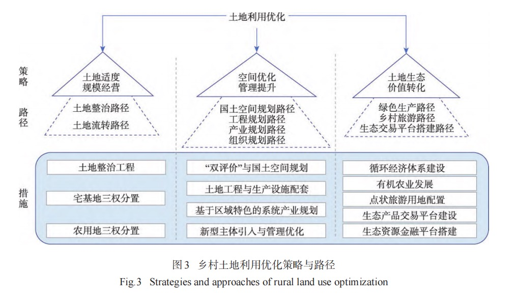 总体来看,在推进乡村土地利用优化时,需以土地适度规模经营、空间优化管理提升、土地生态价值转化策略为指导,强化县域国土空间规划和村庄规划统筹引领作用,完善适度规模经营、土地用途管制、土地增值收益分配等相关管理细节,发挥政府引导作用,鼓励家庭农场、农业合作社、企业等新型经营主体参与,强化自然资源、农业农村等多部门协作,切实发挥土地确权登记办证和国土空间用途管制的基础作用、全域土地综合整治与系统规划的统筹作用、消费市场和用地主体的带动作用以及农民参与和收益分配的惠民作用。