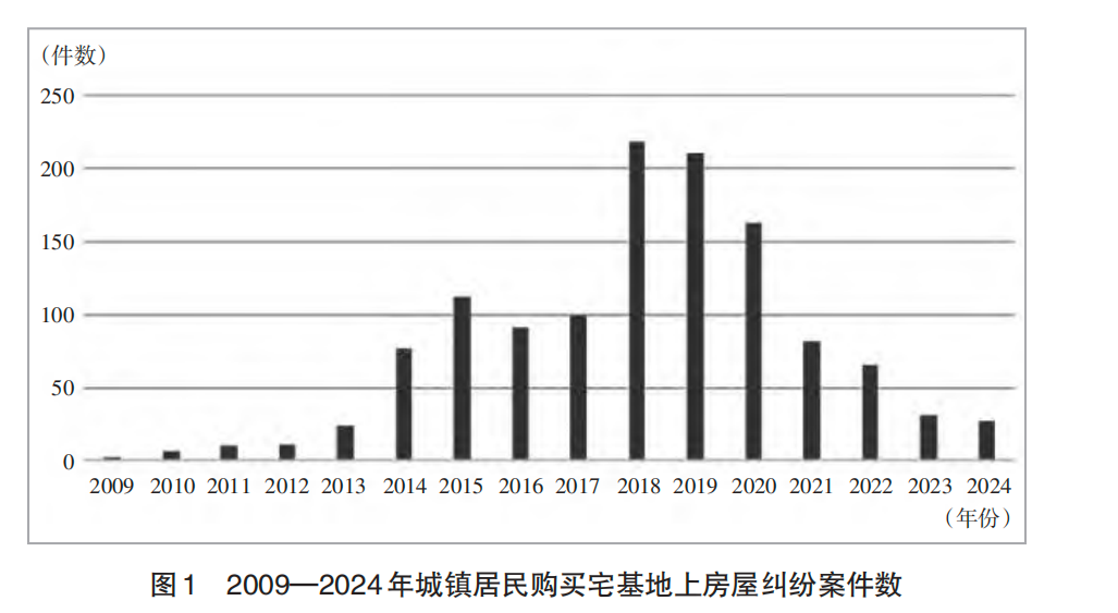 为了体现司法裁判文书查询的全面性,考虑到相关用语并不统一,于是分别以“宅基地使用权”“宅基地房屋”为标题关键词,以“交易”“买卖”“流转”“城镇居民”为全文关键词对相关司法案例进行检索。检索结果表明:2009年至今,审结的纠纷案件总数为1231件;2013年之前,我国宅基地上房屋买卖纠纷数量较少,之后开始不断增加,总体基本呈上涨趋势,2018年特别是2020年之后开始有所回落(见图1)。