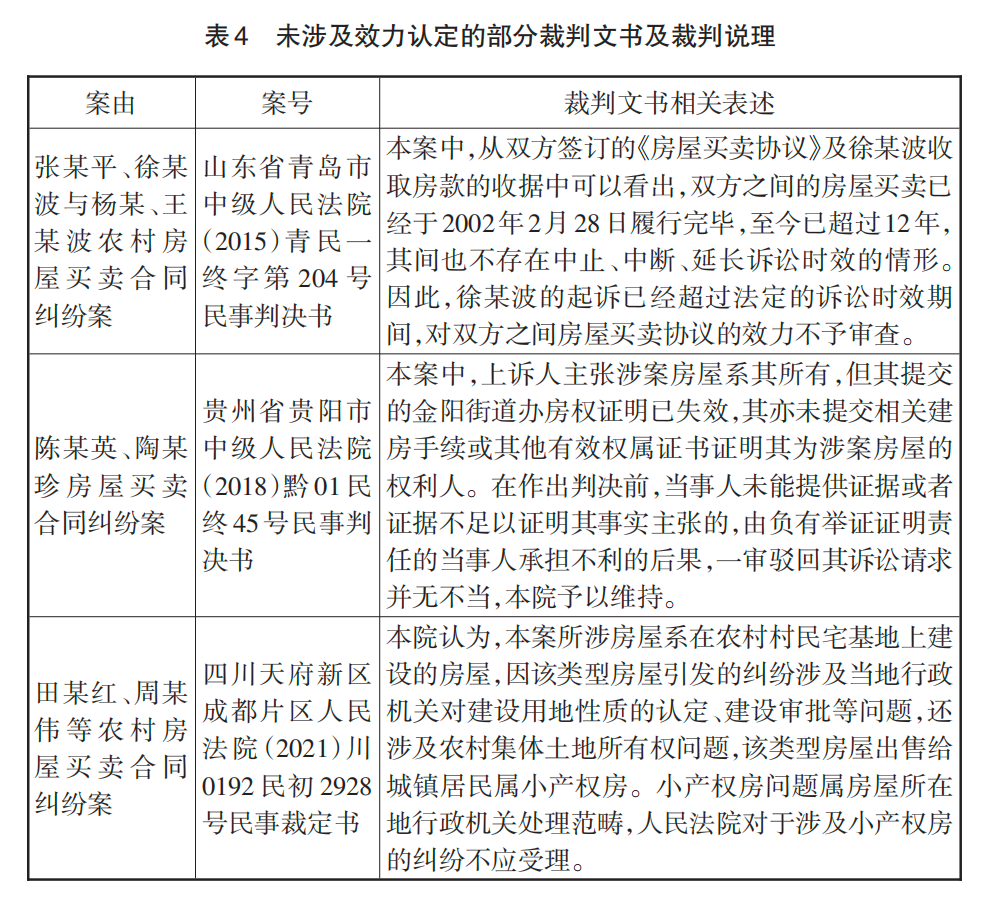 第三,未涉及效力认定的其他情况。具体而言,包括以下几个方面:一是认为集体土地范围内的宅基地房屋买卖协议纠纷适用普通诉讼时效,协议签订至起诉时超过法定诉讼时效的,对双方之间的房屋买卖协议效力不予审查。二是对涉案房屋的权利归属、双方有关买卖的民事法律关系等基础事实缺少证据证明的,以证据不足等理由驳回起诉。三是部分法院认为宅基地上房屋买卖纠纷涉及土地性质、建设审批及集体所有权问题,售予城镇居民则为小产权房,此类问题应由当地行政机关处理,法院不应受理相关纠纷。如表4所示。