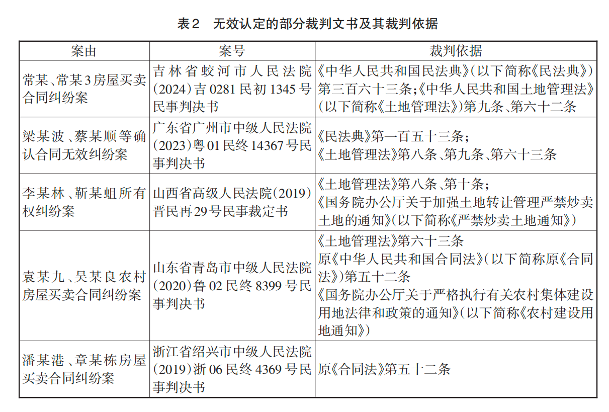 其一,属于原《合同法》第五十二条第(五)项“违反法律、行政法规的强制性规定”合同无效的情形。因为该条为引致条款,不能成为独立的裁判依据,必须援引具体的法律规范,此时主要援引的法条为《土地管理法》第六十二条或第六十三条。也有部分判决只是模糊地阐述买卖合同违反法律法规的强制性规定,应属无效,但未具体阐明所依据的法律规范的情况。