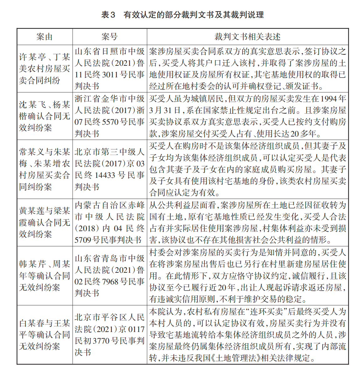 第二,宅基地上房屋买卖协议被认定有效。在这一类裁判结果中,认定买卖协议有效的类型总结如下:一是买受人购买房屋后实现户籍身份的转变,由“非转农”成为该房屋集体经济组织的一员;二是房屋买卖协议订立在1999年修订的《土地管理法》和国家禁止性规定生效之前;三是买受人的家庭成员系房屋所在地集体经济组织成员;四是宅基地上房屋买卖之后土地性质已转为国有土地;五是买受人为非本集体经济组织成员但实际居住并形成稳定的社会关系,因经济利益原因毁约有悖诚信原则;六是房屋经过多次买卖后,最终流转到本集体经济组织成员手中。如表3所示。