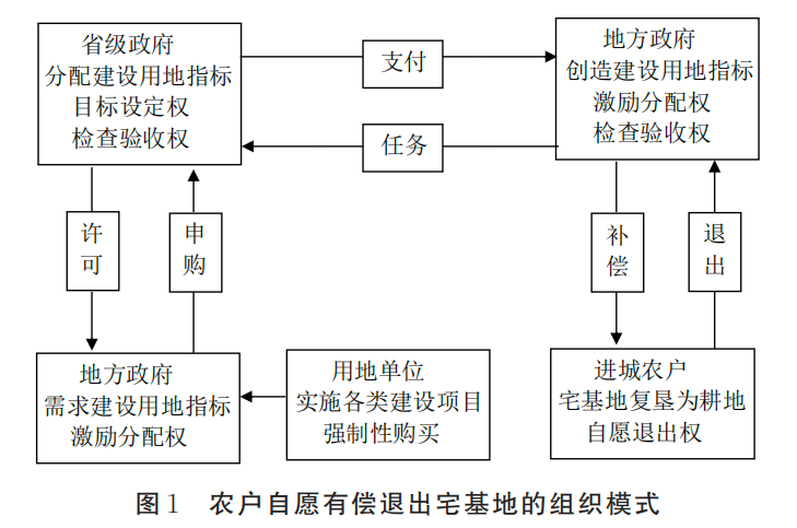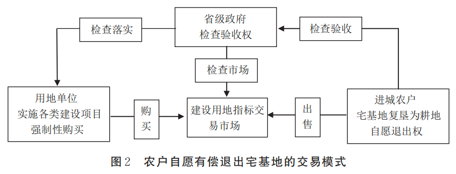 三是检查验收建设用地指标的省级政府。与组织退出一样,省级政府是建设用地指标创造、交易与使用的最终决定方,有权检查验收农户创造的建设用地指标是否合格、建设用地指标市场的交易是否合规以及用地单位落实建设用地指标是否到位等。但与组织退出不同的是,省级政府不再享有建设用地指标的目标设定权,不向计划外建设用地指标的需求方与创造方分配目标任务(见图2)。