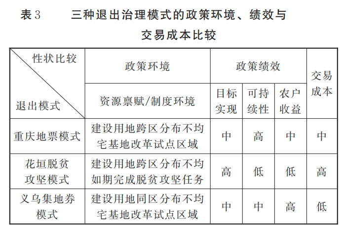 政策环境、绩效与交易成本比较。三种模式的政策环境存在较大差异。重庆地票模式下,重庆是宅基地试点改革区域,城乡建设用地利用跨县级行政区域分布不均;在花垣脱贫攻坚模式中,花垣县非宅基地试点改革区域,城乡建设用地利用跨县级行政区域分布不均。2016年,《国土资源部关于用好用活增减挂钩政策积极支持扶贫开发及易地扶贫搬迁工作的通知》提出,要充分利用建设用地增减挂钩政策支持易地扶贫搬迁,该政策被作为筹措扶贫资金的重要工具;义乌集地券模式里,义乌市是宅基地试点改革区域,城乡建设用地利用在同县级行政辖区内分布不均。