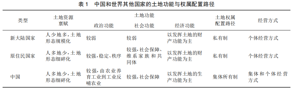 在世界范围内,主要有两种农业形态和村庄社会,即原住民国家和新大陆国家(陈锡文,2012)。中国虽然属于原住民国家,但又有自己的特殊性。本文将新大陆国家、原住民国家和中国的土地资源禀赋、耕地功能、土地权属配置和经营方式总结如表1所示,并详细比较土地功能差异对土地权属配置路径的影响。