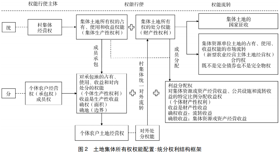 第二,当下中国农村集体土地所有权权能配置结构,应是土地生产性权利和财产性权利的统分构架。中国农村土地集体所有这一政治性制度安排,既需要将集体权利个体性实化,又需要将个体权利集体性统合,才能实现土地生产功能和财产功能的共促。集体土地权利在个体层面的体现,主要是个体农户获得并行使特定集体土地的经营权,从而直接发挥土地的生产功能。相应的个体权利在集体层面的整合,则表现为集体组织将土地转由新型农业经营主体经营,更好地发挥土地的生产潜力,实现土地的财产功能。
