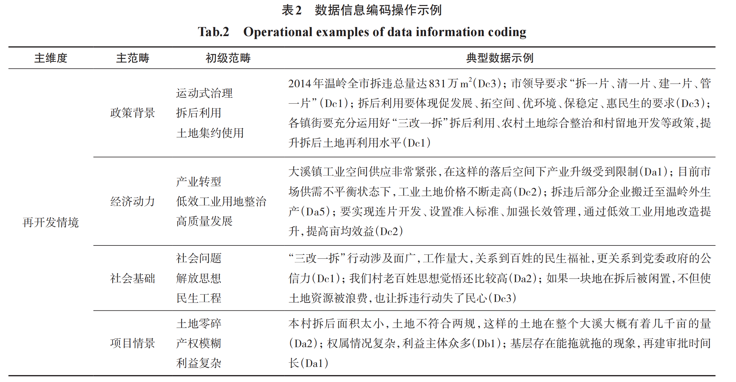 在数据处理方面主要分两步骤。第一步,按照事件发生的时间序列对案例数据进行梳理归类。由于案例样本较多,且跨越时间维度较长,一方面依据“三角验证”原则尽可能再现案例的故事,以保证研究提出的理论命题和演化机制的可信度。另一方面对案例进行分类型和分阶段整理。案例分类主要依据开发主体分为村集体主导、国有平台主导、开发商主导和工业企业自建4种类型,同类型案例选择2~3个典型案例进行深入剖析。4种类型案例演进时间上有一定的先后性,但在一定时间段是并列的,依据案例类型出现的关键时间点,将拆后再开发过程大致分为4个阶段(图2)。第二步,对案例材料和数据赋予标签并进行逐级编码,编码分为开放式编码、主轴式编码、选择性编码3个过程。首先将数据进行开放式编码并形成初级范畴,然后通过主轴编码归纳形成主范畴,最后将主范畴按照分析框架的3个主维度进行分类,进而凝练形成研究的核心范畴和理论模型,表2为再开发情境维度的编码示例。在理论总结阶段要回到4阶段的案例中不断进行比对和验证,需要确保案例对于理论和结论的支撑性,验证案例数据证据并进行补充和查证,对于同一阶段不同的类型案例分支进行分析,以保证研究结论的可靠性。