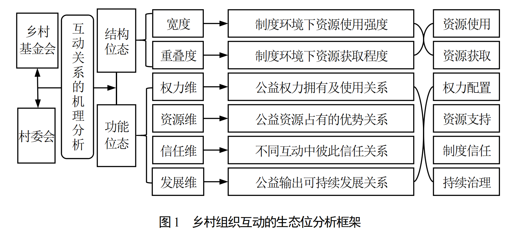 另一方面,在乡村组织功能上,主要是融合生态位态势理论,基于不同的乡村组织在系统中拥有的不同机能,可分别运用“权力维”、“资源维”、“信任维”和“发展维”等关键维度来表征乡村基金会与村委会互动中的功能位态关系。其中,乡村基金会与村委会在乡村公益事业上的互动既包含过去发展的积累结果,代表乡村组织对乡村公益实体资源或无形资源支配地位的静态性功能位态,也包含未来发展的进化能力,代表其对乡村公益内部环境和外部环境作用能力的动态性功能位态。静态性功能位态主要包括权力维度关系和资源维度关系,反映的是乡村组织开展乡村公益事业的权力拥有及使用和公益资源占有上的相对优势,其核心分别是权力配置和资源支持。而动态性功能位态主要包括信任维度关系和发展维度关系,反映的是在不同公益沟通和互动模式下乡村组织间彼此信任状况和乡村公益服务价值输出上可持续发展程度,其核心分别是制度信任和持续治理。正是在生态位结构和功能的变动中,乡村组织间会形成乡村公益事业上替代型竞争、交换型竞争或共栖型竞争等趋适竞争逻辑关系。关于乡村组织互动的生态位分析框架,具体见图1。