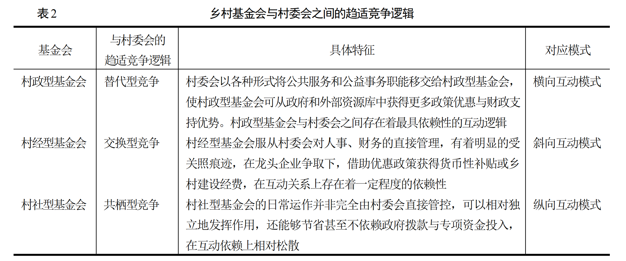 在乡村社会网络中,乡村基金会相对弱势的地位在相当程度上抵消了乡村基金会作为社会组织的自主诉求,促使其进一步为了获取资源支持而展开趋适竞争,以实现组织的常态化生存和持续性发展。根据村政型基金会、村经型基金会和村社型基金会与村委会之间趋适竞争程度的不同,可依次将二者之间的趋适竞争逻辑归结为替代型竞争、交换型竞争和共栖型竞争(如表2所示)。在替代型竞争中,村委会在某些情形下作为公权力委托代理人,掌握着村政型基金会人事安排、财务管理上的主导权,并以各种形式将自身的公共服务和公益事务职能移交给村政型基金会,使其具有较强的竞争优势。而在交换型竞争中,村经型基金会可秉承“资金决定发言权”原则以出资多寡来取得基金会理事长的相对任命自由,但也在很大程度上服从于村委会对人事、财务的直接管理,在部分性受控中有着明显的受关照痕迹,从而也具有一定的竞争优势。在共栖型竞争中,村社型基金会的日常运作并非完全由村委会直接管控,在人事安排、财务管理上更多体现为基金会与村委会的疏离关系,可以相对独立地在村委会让渡的公益空间内发挥作用,但通常短期内只有较小的竞争优势。