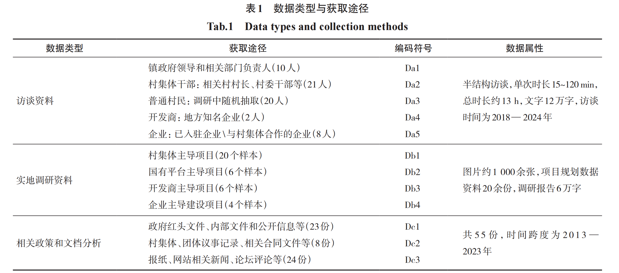 本文采用单案例研究法,通过2018—2024年不间断的田野式调查,深入大溪镇各村庄了解非正规工业用地再开发过程。研究数据主要来源于实地调研、现场访谈、政府文件与报告、官方网站资料与新闻等(表1)。首先,研究团队通过与镇政府相关领导与负责人、村委干部、村民、开发商和企业人员等知情人与利益相关人进行半结构式访谈,共获取录音数据时长约13 h,转录文字约12万字。其次,通过6次现场调研获得全镇36个存量再开发项目样本,并整理成调查报告约6万字。此外,通过调研获取政府公开文件和内部材料,以及搜集网站相关公开信息、新闻报导、评论等共55份材料与文档,时间跨度为2013—2023年。