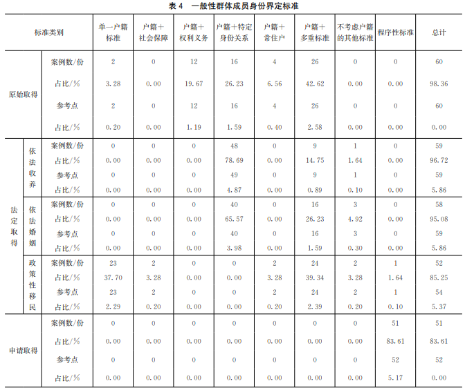 一般性群体指在实践中对该类群体的身份界定形成了一套较为规范的普适性界定原则且文本中普遍提及,现实中普遍存在的群体,一般分为原始取得、法定取得、申请取得。一般性群体成员身份界定标准如表4。