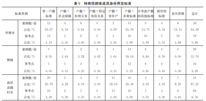赘婿。不同标准在赘婿群体的分布为:户籍+多重标准(18.03%),不考虑户籍的其他标准(9.84%),单一户籍标准(8.20%),程序性标准(6.56%),户籍+特定身份关系标准(4.92%),户籍+权利义务标准(3.28%),户籍+社会保障标准(1.64%),户籍+常住户标准(1.64%)。赘婿群体多采用户籍+多重标准,如江西省抚州市南丰县规定如果女方家庭有女无儿、儿子没有赡养能力或女儿尽主要赡养义务的,男子取得女方所在农村集体经济组织户籍且在女方生产生活的,可以取得女方所在地农村集体经济组织成员资格,如果有儿有女户给女儿招赘上门女婿或者多女无儿户给几个女儿分别招赘上门女婿的,能否取得其妻所在农村集体经济组织的成员身份,由农村集体经济组织民主议定。