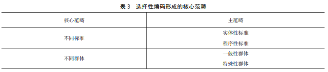 选择性编码即核心编码,是从已经形成的概念类属中概括出能够涵盖全部类属的核心范畴。根据对4个主范畴比对分析,将其分别编入不同标准与不同群体2个核心范畴。选择性编码与核心范畴如表3。
