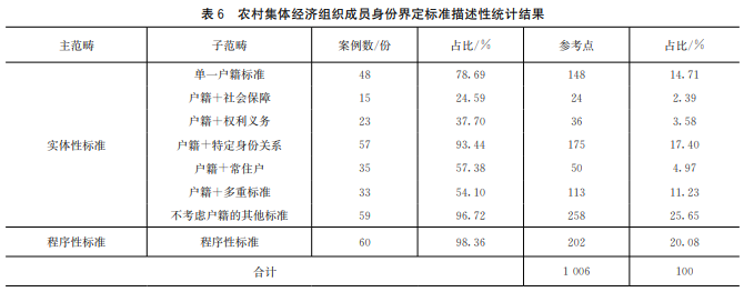 实证发现,户籍+常住户标准与户籍+权利义务标准使用比例分别为57.38%、37.70%,基于新型城镇化战略背景与市场化的经济体制,农村人口大量涌入城镇,在此基础上界定成员身份,要求形成稳定的权利义务关系与生产生活关系难以实现,故该两类标准在实际应用中的适用性不高。
