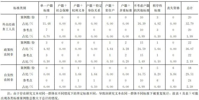 外出经商务工人员。不同标准在外出经商务工人员群体的分布为:不考虑户籍的其他标准(16.39%),单一户籍标准(11.48%),程序性标准(4.92%)。界定外出经商务工群体较常使用不考虑户籍的其他标准。如江西省抚州市宜黄县规定对务工经商、购房、就学参军、投靠子女等,将户籍关系迁出的原本村(社区)人员及其子女保留其成员身份。