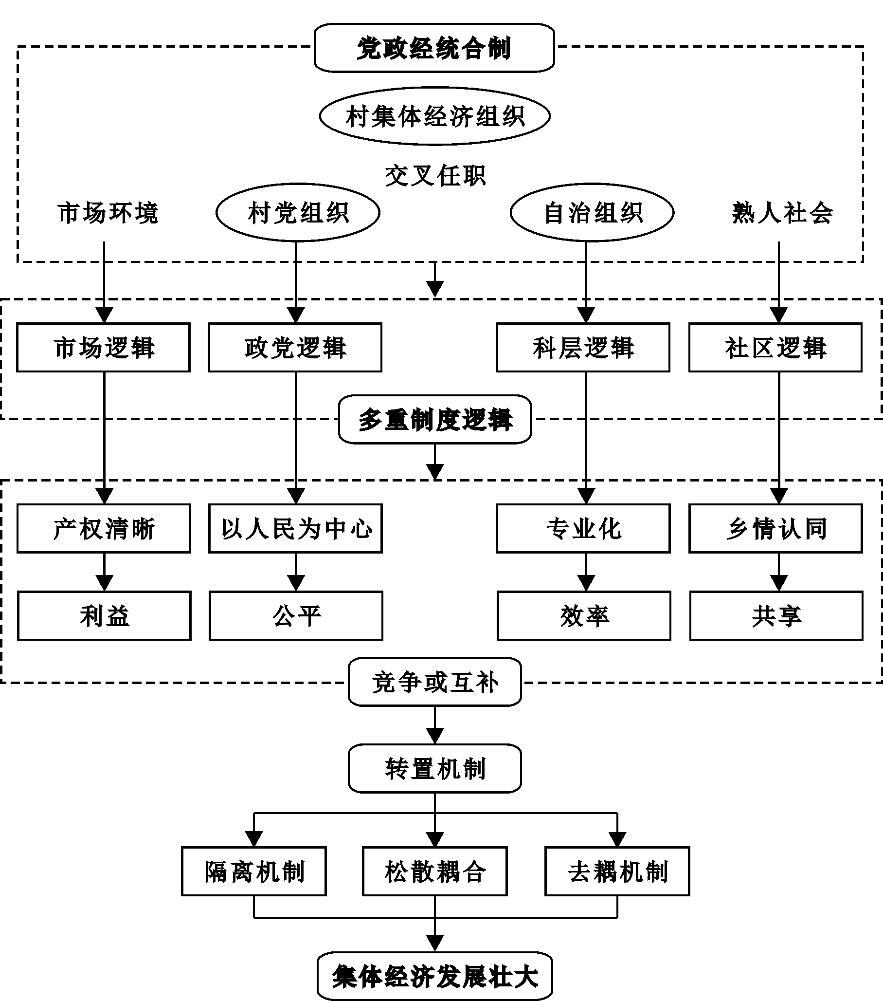 图1 “党政经统合制”通过转置多重制度逻辑推动农村集体经济发展壮大