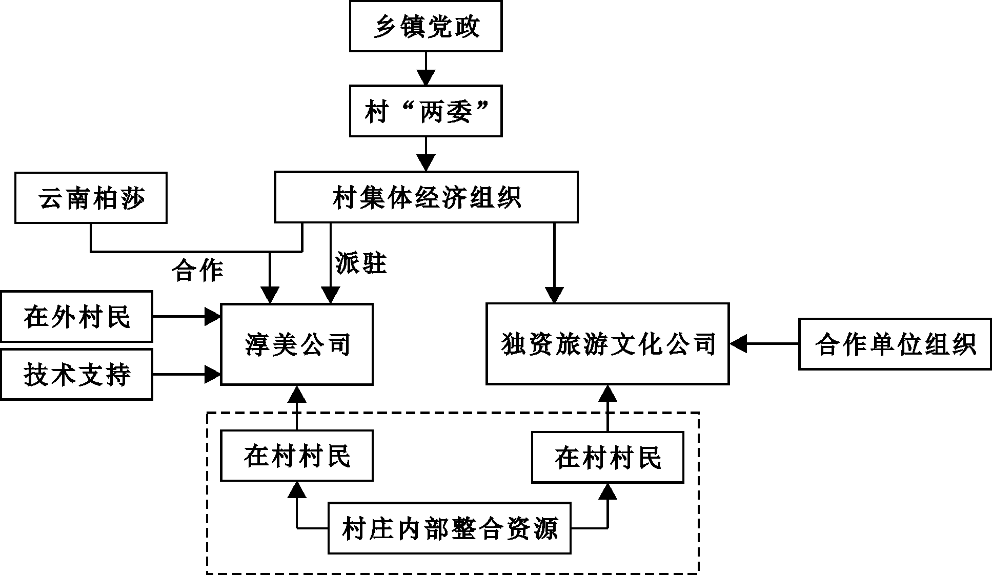 2000年M村合并了周围两个行政村,成立新的M村,合并之后的行政村内有十多个大大小小的自然村。在合并初期,为了安抚各村并安置原有的村干部,因人设岗,村党支部书记、村主任、集体经济组织负责人及村会计分别由原各村书记、村主任担任,其余村干部经村民选举与上级考察后任职。在此后十多年时间中,村级组织涣散,领导班子松散;各村之间隔阂很深,集体荣誉感不强,向心力不足;村内资源匮乏,集体资产不清;青壮年外出务工较多,发展集体经济的动力不强。面对这种情况,乡镇政府动员外出经商的村民ZHD回村任职书记,以期能够改变M村的发展局面。ZHD书记到任后,在全面调研的基础上愈加坚信:要想改变现状,必须强化党的领导,建立一支敢闯敢拼的村“两委”班子。党的十八大以后,通过村民民主选举,ZHD兼任村主任和村集体经济组织负责人。村“两委”班子和集体经济组织主要领导之间交叉任职,产生了“党政经统合”型组织。村“两委”在市场调研的基础上,引入云南柏莎科技有限公司(以下简称“柏莎公司”),实行村企合作,成立宜兴市淳美文化发展有限公司(以下简称“淳美公司”)。在此基础上,村集体经济组织作为发起人,成立了M旅游文化教育公司。两公司均由村集体经济组织派驻村干部参与管理,形成党组织引领、企业市场化运作、村民广泛参与的三级联动、多元共治的经济发展模式(见图2)。