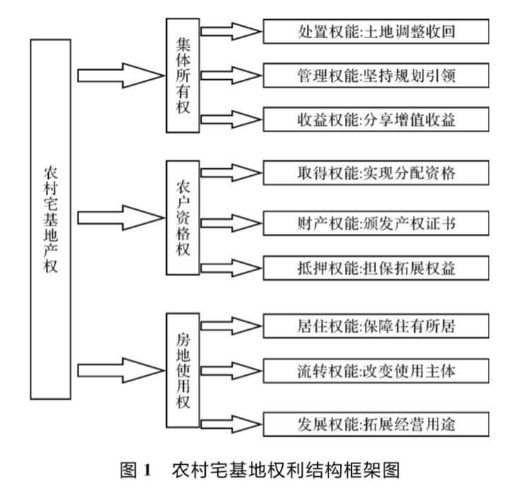 农村宅基地制度的核 心 是 产 权 问 题。完 备的产权是关于资源利用的所有权利构成的具有排他性、收益性、可让渡性、可分割性等特征的“权利束”。阿尔钦等认 为,产 权 是 一 组 关 于 财 产 的 权利,包括所有权、占有权、使用权、收 益 权、处 分 权等。土地的终极所有权、占有权和使用权由于现实生产的需要而经常被分离开,形成多主体的产权构成。我国现行的宅基地制度是宅基地所有权归农民集体所有,使用权归依法取得的农户所有,所有权与使用权分离属于不同主体的制度。
