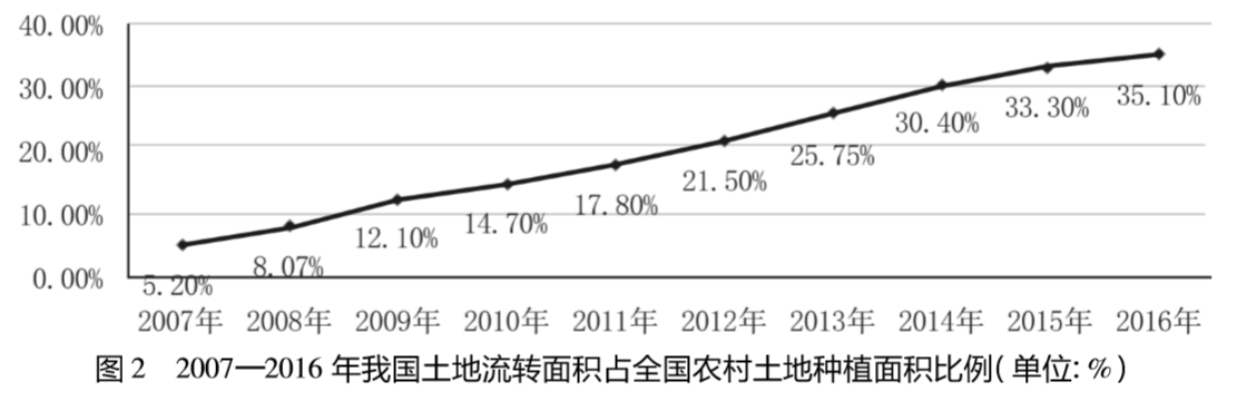 近年来,我国农地流转规模逐年扩大。由于前期没有提出合理有效的政策,在 1990 年代以前,我国农地流转一直处于低效率水平。随着城市化建设、农业产业化和农村现代化的进一步发展,尤其是新一轮土地承包经营权相关政策的发布,我国农村土地流转速度加快,流通规模逐年扩大,农业的规模化经营水平不断提高。根据土流网提供的数据, 2007 年我国农村进行土地流转总面积约为 0.64 亿亩,此后逐年增长,2012 年上升至 2.78 亿亩,2014 年后土地流转面积增速有所减缓,2016 年达到 4.7 亿亩,比 2007 年增加 4.06 亿亩,十年间土地流转面积增加六倍多(详见图 1) 。伴随“三权分置”改革的进行和乡村振兴战略的实施,我国农村土地流转的总面积存在逐年增加的趋势。2007 年土地流转面积占全国农村土地种植面积的 5.2% ,此后逐年增加,2012 年上升至 21.5% ,比 2007 年上升 16 个百分点,2016 年达到 35.1% ,2006—2017 年十年间土地流转面积占全国农村土地种植面积增加近 30 个百分点(详见图 2) 。