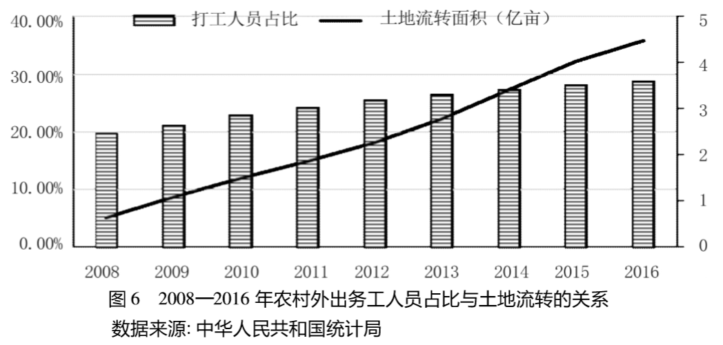 农业生产的收益相对较低,而且较为辛苦,随着我国经济发展和城镇化进程的加快,越来越多的农民选择外出打工,农村大量劳动力转移到了城市从事非农业生产。由于劳动力外出打工,从事农业生产的人口减少,农户的承包地开始大量流转给其他从事农业生产的经营主体。根据国家统计局数据, 2008 年我国农村外出务工人员为 14 041 万,占农村人口数的 19.9% ,农村土地流转面积为 0.64 亿亩。自 2008 年开始,农村外出务工人员占比逐年增加,到 2016 年增加至 28.7% ,我国土地流转面积同样逐年上升,到 2016 年我国土地流转总面积达到 4.7 亿亩(详见图 6) 。由此表明,农村外出务工人员占农村人口的比例与农村土地流转面积呈正相关关系,即随着农民外出务工的人数增加,我国土地流转面积也逐渐上升,农村劳动力转移促进了农村土地流转。