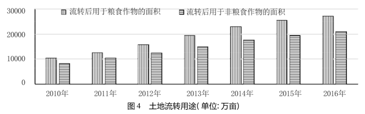 目前,我国农村土地流转后的用途主要分为进行粮食作物种植和用于非粮食作物即经济作物种植。根据土流网的数据,2010 年到 2016 年,我国农地流转后用于粮食作物种植的面积一直大于非粮食作物种植的面积。随着土地流转规模的扩大,流转后用于粮食作物种植和非粮食作物种植的面积都逐年增加。用于粮食作物种植的面积由 2010 年的 10 281万亩,逐年增加,到 2016 年增长到 27 090 万亩,年均增长率达到 17.5% 。流转后用于非粮食作物种植的面积由 2010 年 8 037 万亩增长到 2016 年 20 831万亩,年均增长 17.2% 。由此可见,两者增长的速度基本一致。从所占比重来看,2010 年,两者分别占比 56.1% 和 43.9% ,2016 年,两者分别占比 56.5% 和 43.5% ,用于粮食作物种植的面积一直高于用于非粮食作物种植的面积,用于粮食作物种植的面积所占比重有所增加,用于非粮食作物的面积所占比重则有所下降(详见图 4) 。由此可见,粮食作物种植的规模经济效益更为明显。