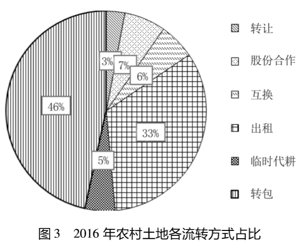 近年来,农村土地流转形式越来越多样化,包括转包、租赁、互换、转让、股份合作、土地信托等。其中,转包和租赁是主要形式,股份合作和土地信托等新兴流转方式越来越普遍,农村土地流转形式呈现明显多样化的趋势。根据土流网的数据,在 2016 年,我国土地流转形式主要以转包和出租为主,46% 的土地以转包的形式流转,接近总流转方式的一半,转包存在明显优势,出租占比 33% ,接近 1 /3,转包和出租共占 79% ,成为土地流转的主要形式。股份合作占比 7% ,互换占比 6% ; 转让仅占 3% ,还有 5% 的土地以其他形式进行流转,如临时代耕、土地信托等等(详见图 3) 。