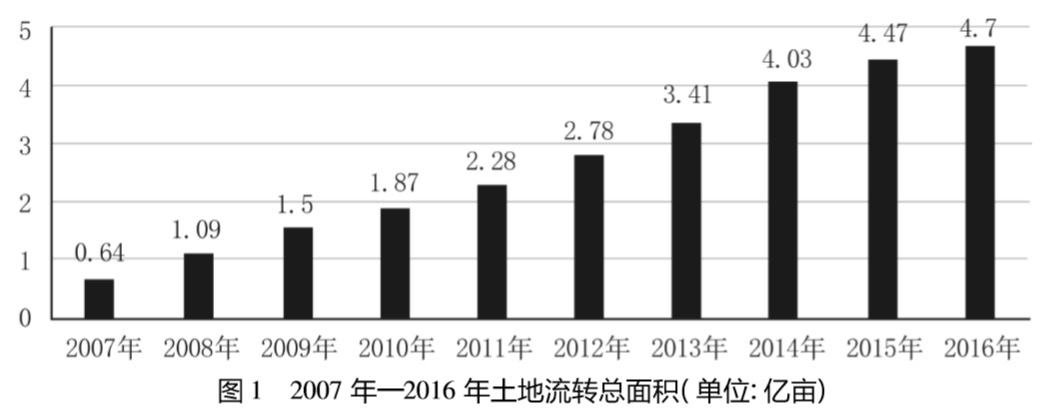 上述研究从多个层面分析了农村土地流转的现状、影响因素、存在的困难等问题,但仍存在可拓展的空间。目前国内关于农村土地流转的研究大多从单方面出发,并对此方面的某个因素进行细致的分析,一般较少综合考虑多方面因素对土地流转发展的影响。此外,关于研究我国农村土地流转影响因素的论文,数据较为陈旧,对现在的发展并没有太大的参考价值。特别是“三权分置”改革后,农村土地流转与之前相比是否显著增加,是否有新的变化,这些都需要进一步研究。针对以上问题,本文在已有的研究基础上,分析 2007—2016 年土地流转相关数据,对目前我国农村土地流转规模、流转速度、流转形式、用途及去向等现状进行考察,并对当前影响我国农村土地流转的农村劳动力、农村土地意愿供给、土地流转体系等可能性因素进行总结,进而提出相关对策建议,完善农村土地流转体系,促进农村土地流转。