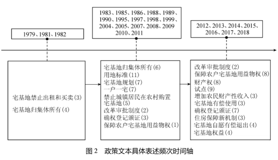 一直以来,众多学者围绕宅基地管理政策相关问题进行了广泛的研究。研究内容主要涉及: 按照宅基地权属性质等标准来划分宅基地制度变迁的阶段,探究宅基地制度存在的问题和矛盾,以及提出有关宅基地制度改革的相关设想及未来方向的建议。其中也不乏多学派、多视角的理论和实证研究,如从法学、经济学、社会学的视角进行阐述和分析。然而,至今尚未有以“政策意图”为切入点,运用文本分析方法来对宅基地管理政策意图与具体演化路径进行的研究。鉴于此,本文拟以 1978 年以来农村宅基地制度改革相关政策文本为分析对象,通过文本分析,挖掘所得文本数据,总结文本发现,理清演化路径,以期为揭示宅基地管理政策调整的内在逻辑及其发展规律、展望宅基地管理政策发展前景提供参考。