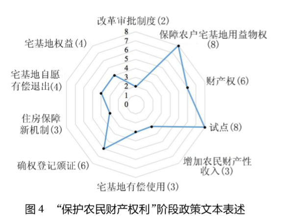 由图 4 中“保障农户宅基地用益物权”“财产权”等频次较高的表述能够看出,近年来,宅基地财产性功能相较其社会保障功能,更加受到政策关注。现阶段宅基地管理政策的主要意图是使宅基地用益物权的财产属性在试点探索中进行落实,具体而言,就是通过改革试点地区的实践,探索赋予与保护农民对宅基地的财产权利,增加农民财产性收益的路径。在保持宅基地集体所有权不变的同时,完善宅基地权利体系,探索落实农民宅基地用益物权是本阶段最为鲜明的特征。目前,改革方向明确,相关工作正持续推进,取得了一定进展,但改革结果尚需深入探索。