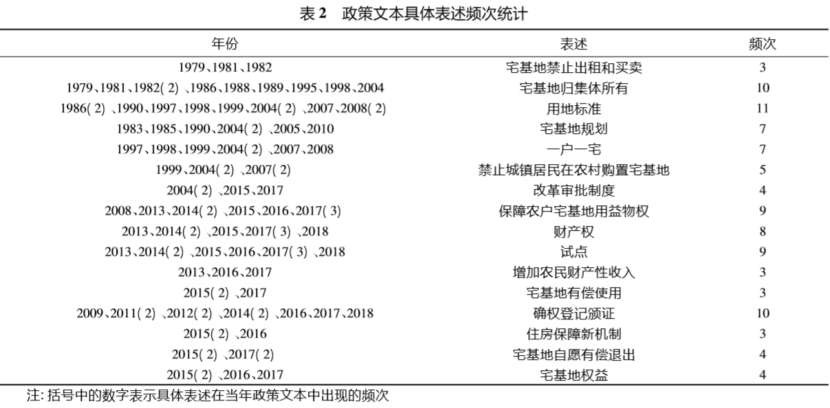 文本分析方法实质是从众多的具体文本中进行抽象概括的过程,也是文本读者运用多种“解读”方法和视角,与文本生产所处的历史脉络对话,以发掘文本“深层结构”的过程,是透过文本显性话语考察政策话语运作本质的过程。在文本内容中,文字使用频率的变化往往反映了人们对于事物的认知与重视程度的变化。因此,本文对宅基地管理政策中有关制度安排的具体表述进行文本分析,统计高频率表述,锁定政策在制定过程中的重点关注部分,进而探寻宅基地管理政策变迁中政策意图的演进规律。