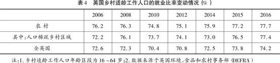 由于英国政府长期实施支持乡村发展的优惠政策, 吸引了各类投资主体投向乡村实业, 带动了乡村庞大的劳动力市场, 使城乡就业二元性差距得以缩小。20世纪80年代后, 在英国“逆城市化”影响下, 城市的很多发展功能逐步向乡村转移, 英国乡村的就业行业分布逐渐与城市接近, 呈现了更多的多样性。进入21世纪, 虽然受全球金融危机影响乡村适龄工作人口的就业比率由2008年的76.3%持续下滑到2011年的74.5%, 但2006—2016年英国乡村适龄工作人口的就业比率一直高于同期城市和全英格兰的平均水平 (见表4) 。