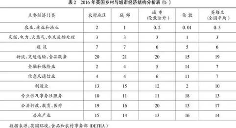 英国作为全球最早实施工业化革命的国家, 其乡村与城市的经济结构呈现一定的趋同性, 其中乡村制造业及关联产业对英国乡村经济结构的演化发挥了重要的作用。2016年, 农业、林业和渔业国民生产增加值在经济结构中占比仅有2%, 而乡村制造业 (13%) 、专业性及事务性服务 (10%) 、房地产业 (15%) 及物流、交通运输、食品服务活动 (20%) 等二、三产业占比高。 (见表2)
