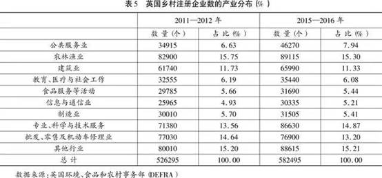 英国政府特别支持乡村企业面向多样化产业领域开展经营, 2015—2016年农林渔企业占英国乡村区域内注册企业数的15.30%, 同样地, 专业化科技服务业企业占14.87%, 批发、零售及机动车修理类占13.20%, 建筑业类占1.33% (见表5) 。