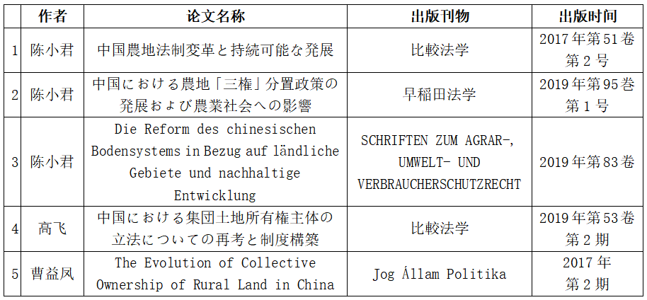 土地法制研究院自2016年5月建院以来,在巩固国内土地法制研究一流地位的基础上,注重加强对外学术交流,逐渐形成国际影响力,稳步树立理论自信。云山领军学者陈小君教授、院长高飞教授和曹益凤助理研究员在德国哥廷根大学农业法研究所主办的《农业法、环境法和消费者权益保护法杂志》、日本早稻田大学主办的《早稻田法学》《比较法学》和匈牙利A类法律期刊《国家法律政治》共发表5篇外文论文,向国外学者展示了我国土地法制、集体土地制度方面的立法演进、改革方向及其实效,引起了国际学术界的广泛关注。