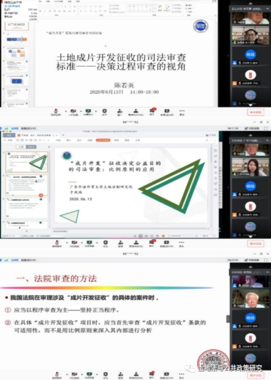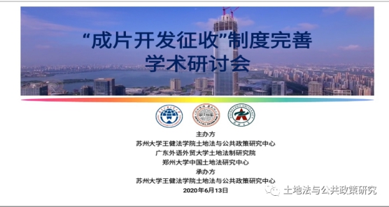 2020年6月13日下午2点,由苏州大学王健法学院土地法与公共政策研究中心、广东外语外贸大学土地法制研究院、郑州大学中国土地法研究中心共同主办,苏州大学王健法学院土地法与公共政策研究中心具体承办的《“成片开发征收制度”完善学术研讨会》以“腾讯会议”辅以同步直播形式顺利召开。来自理论界各大高校、科研院所的研究人员,包括自然资源部、最高人民法院、各级自然资源局和地方法院、律师事务所、土地规划咨询公司、不动产评估公司等单位的300余人一同参与了此次会议。土地法制研究院陈小君教授,院长高飞教授,法学院副院长耿卓教授,土地法制研究院副院长于凤瑞副教授参加了本次研讨。