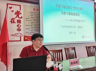 活动首先邀请了广东外语外贸大学土地法制研究院副院长、副教授张凇纶作“中国《民法典》的时代意义与若干新制度要点”的专题宣讲。他围绕“法律体系中民法典定位与“典”之内涵”、“中国民法典编纂背景与立法脉络”、“《民法典》的时代价值与现实意义”、“《民法典》若干新制度要点”等四个方面内容,对《民法典》进行了深入浅出地讲解。