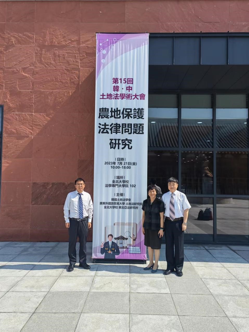 2023年7月21-22日,由韩国土地法学会、中国广东外语外贸大学土地法制研究院和韩国全北大学东北亚法研究所联合主办的第十五届中韩土地法学术大会在韩国全北大学隆重召开,来自中韩两国10多所高校和科研机构的30余名专家学者参加会议。广外云山(法学)工作室首席专家、土地法制研究院名誉院长陈小君教授,广外土地法制研究院院长高飞教授,广外法学院副院长耿卓教授参加了本次会议。