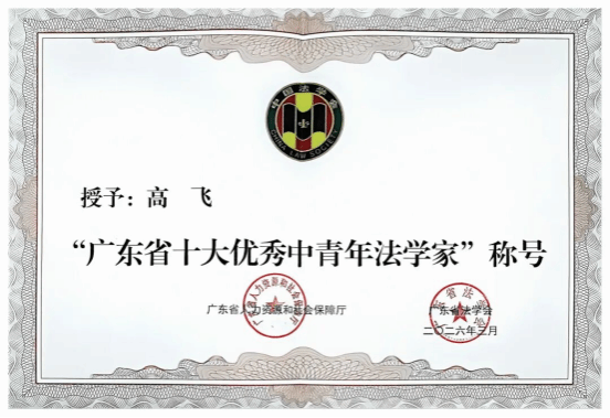 2026年4月25日,广东省法学会第十次会员代表大会在广州召开。省委书记黄坤明作出指示。中国法学会党组成员、副会长杨万明,广东省委常委、政法委书记袁古洁出席会议并讲话。广东省法学会负责同志以及会员代表等近300人参加会议。会议听取并审议了广东省法学会第九届理事会工作报告,选举产生了第十届理事会和领导机构,聘任了第十届学术委员会委员。会议对全省法学会系统先进集体、先进个人和广东省十大优秀中青年法学家进行表彰。广东外语外贸大学土地法制研究院院长高飞教授被授予“广东省十大优秀中青年法学家”称号。