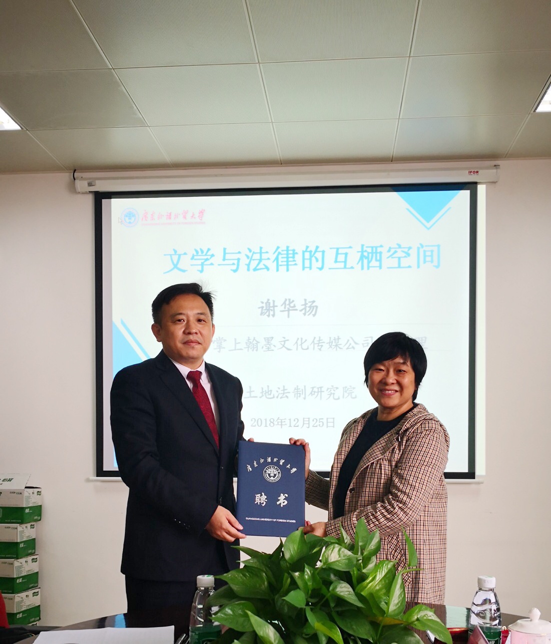 12月25日,土地法制研究院在第七教学楼704会议室举办“文学与法律的互栖空间”讲座,邀请深圳市掌上翰墨文化传媒公司总经理谢华扬先生主讲。讲座由广东外语外贸大学法学院、土地法制研究院副院长耿卓教授主持。