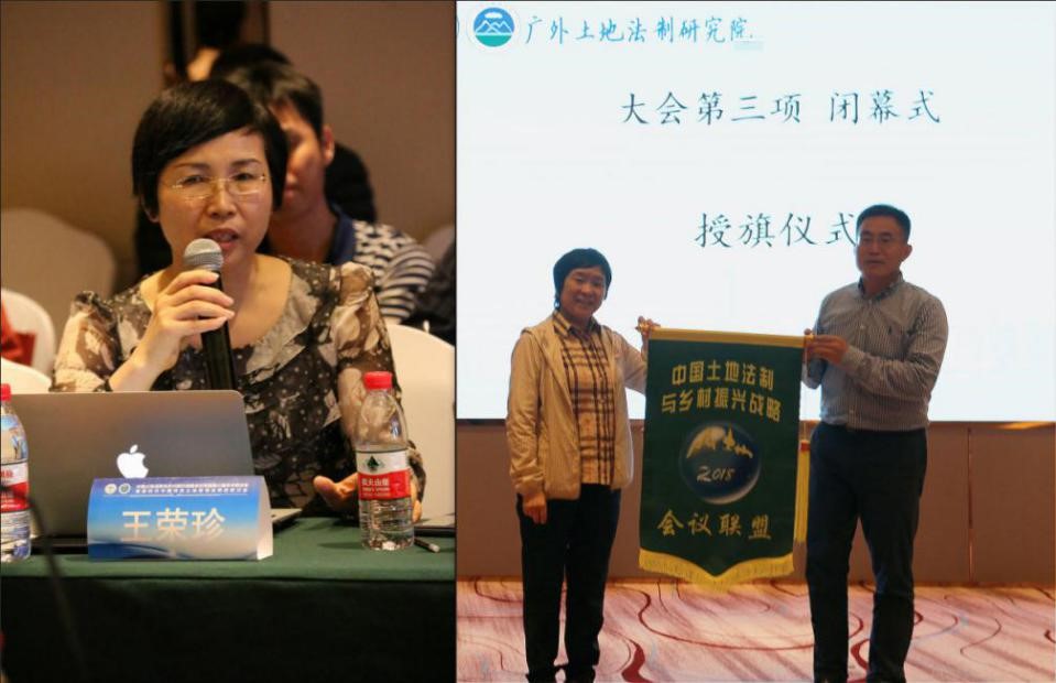 本次研讨会的闭幕式由广东外语外贸大学科研处副处长、法学院王荣珍教授主持,华东政法大学财产法研究院院长、法律学院高富平教授进行总结发言。在闭幕式上,高富平教授公布本次会议申请加入中国土地法制与乡村振兴战略会议联盟的五家单位,分别是浙江大学中国农村发展研究院、南开大学法学院、西南政法大学中国农村经济法制创新研究中心、西北政法大学土地法房地产法研究中心和广州大学不动产研究院,并宣布下届会议由华东政法大学财产法研究院承办。闭幕式最后一个环节是会议联盟会旗交接仪式,在仪式中陈小君教授向高富平教授递送了会旗。本次研讨会在与会代表的掌声中圆满结束。