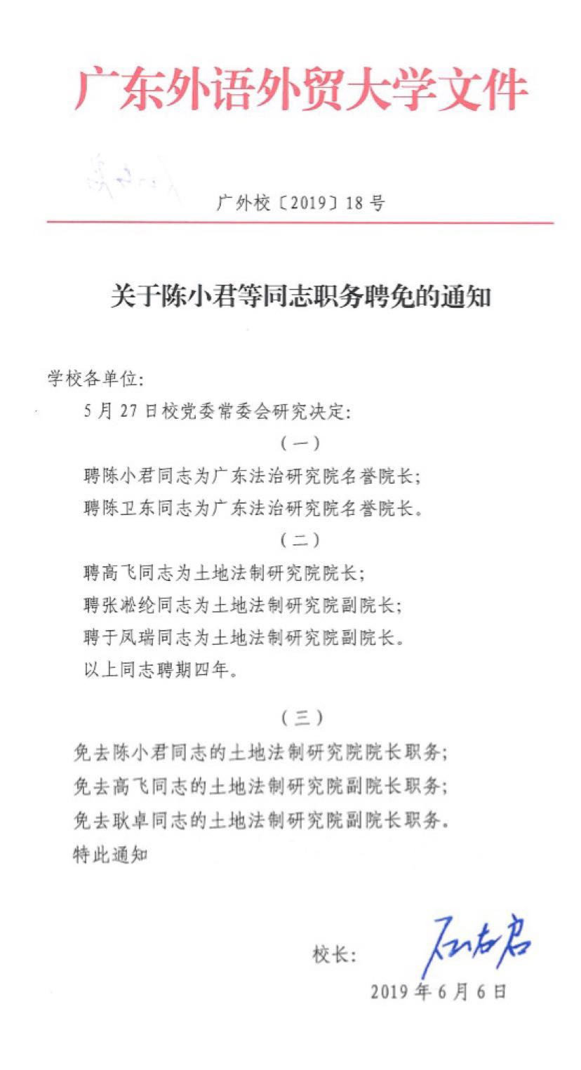 2019年6月10日,广东外语外贸大学(简称“广外”)发布关于陈小君教授等职务聘免的通知。经校党委常委会研究决定,聘任陈小君教授为广东法治研究院名誉院长,免去其广外土地法制研究院院长职务;聘任高飞教授为土地法制研究院院长,免去其土地法制研究院副院长职务;聘任张淞纶副教授、于凤瑞副教授为土地法制研究院副院长;免去耿卓教授土地法制研究院副院长职务,其自2018年12月起已受聘为广外法学院副院长。
